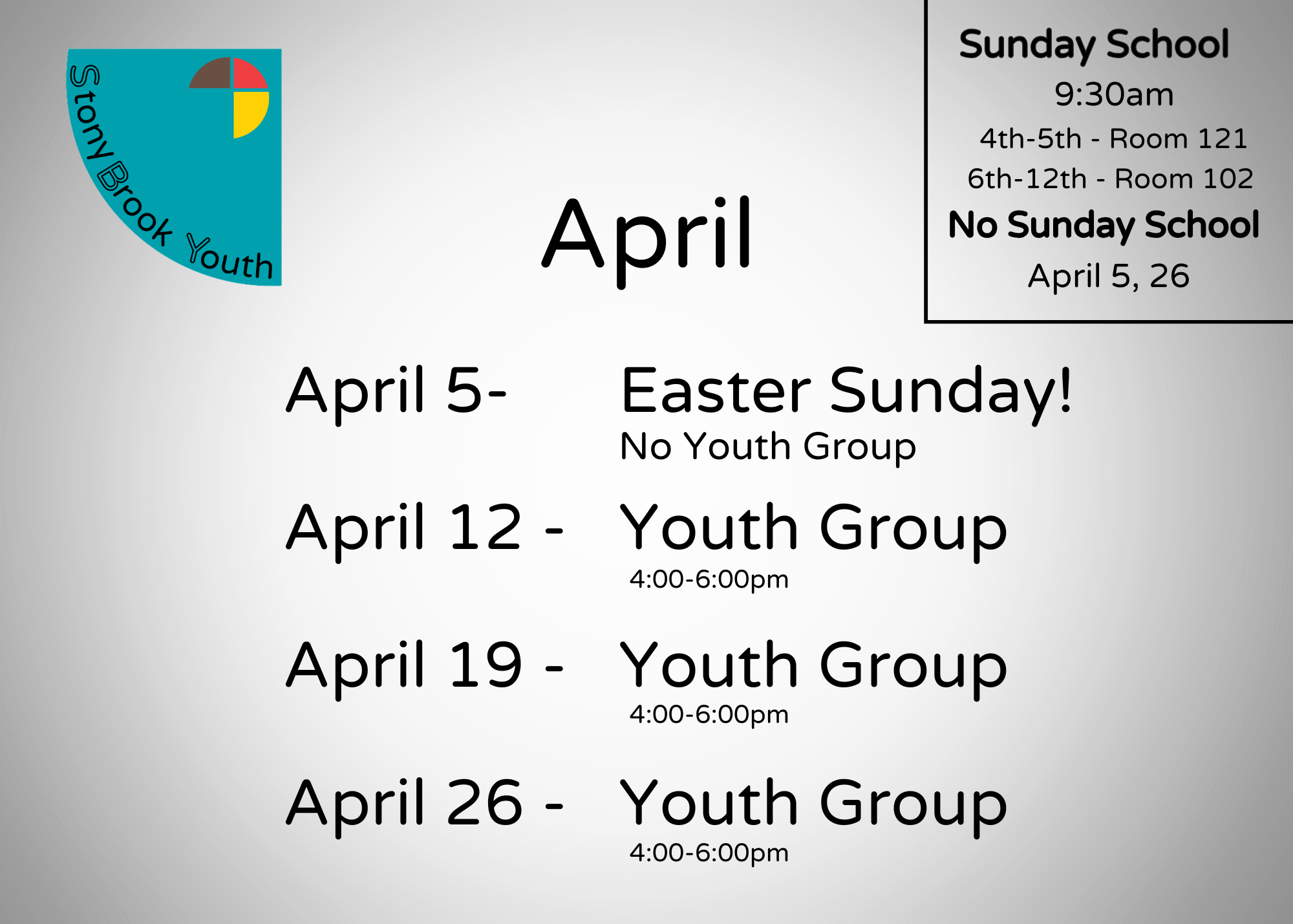 Grades 4-12 meet in room 102 for worship, games, and small group time